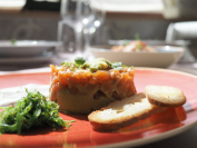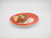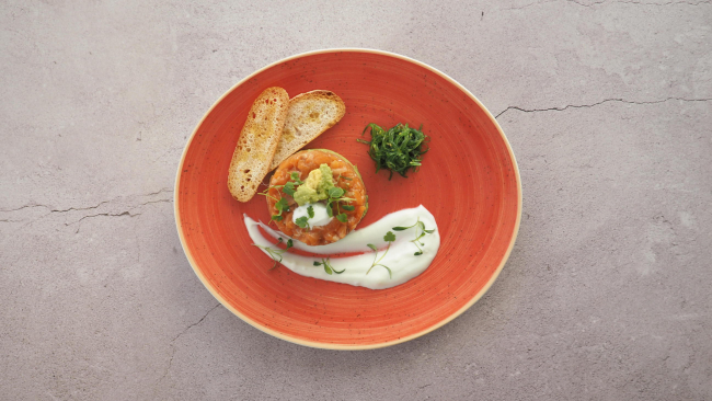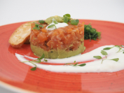 Apetecible tartar de trucha imperial del Grado cortado a cuchillo y marinado. Gracias a su guacamole y un toque de yogur cremoso de Fonz conseguimos un tartar muy jugoso. Acompañamos con tostadas crujientes.
