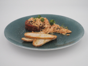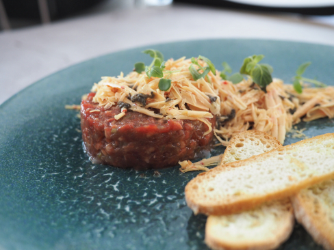 Delicioso steak tartare cortado a cuchillo. Producto autóctono del Valle de Chistau gracias a la ternera Black Angus de Chistau Natural. Lo acompañamos de láminas de foie, aroma de trufa y crujientes tostaditas