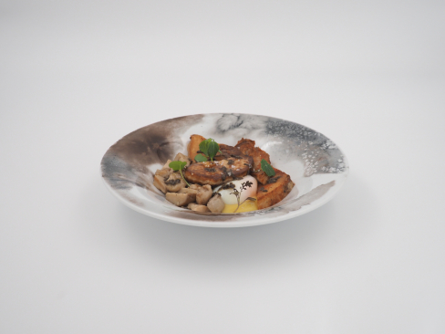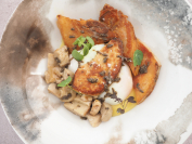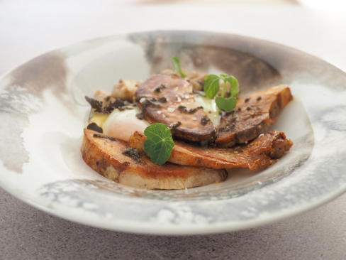 Jugosos huevos ecológicos a baja temperatura, ceps (boletus edulis), foie fresco y papada de latón de La Fueva
