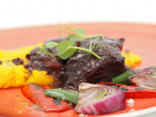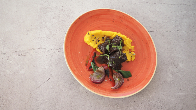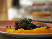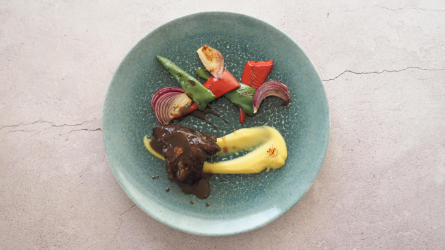 Jugosas carrilleras de ternera pirenaica con base de parmantier de Azafrán de Sobrarbe